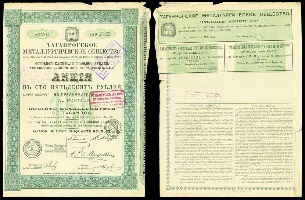 Акция. Таганрогское металлургическое общество. Акция 3 вып. в 150 руб.