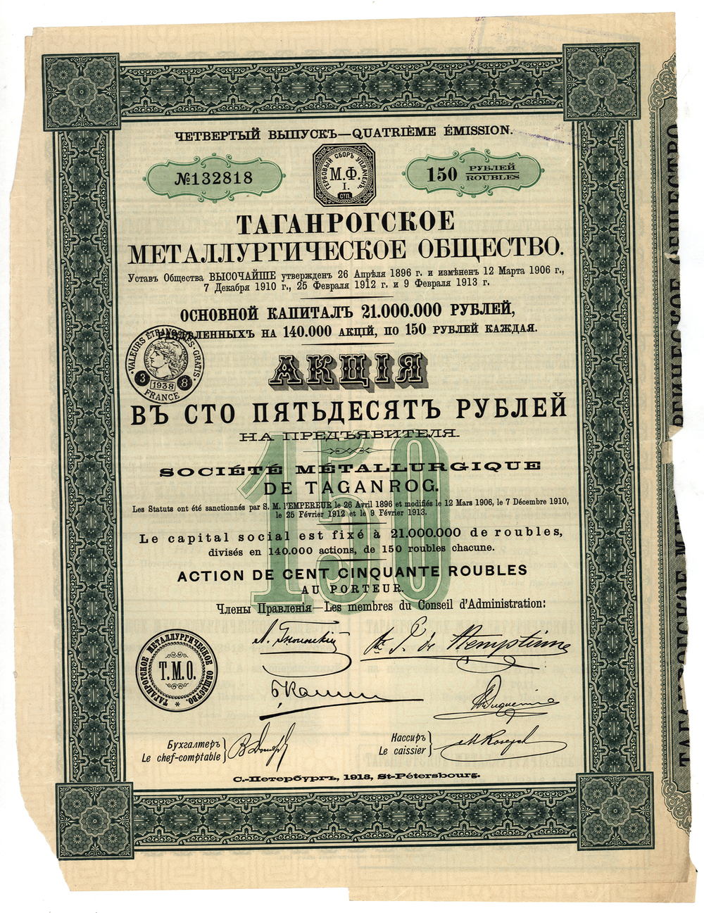 Таганрогское металлургическое общество. Акция. 150 руб. 1913 г. № 132818