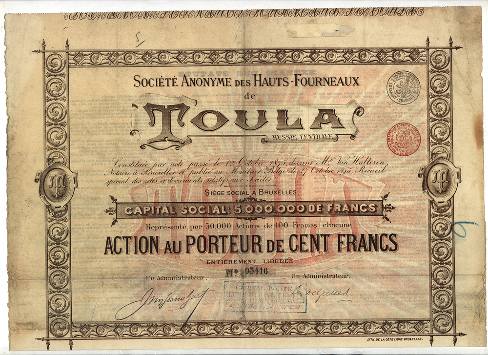 Общество Тульских доменных печей. Акция. 100 франков. 1895 г. № 03416