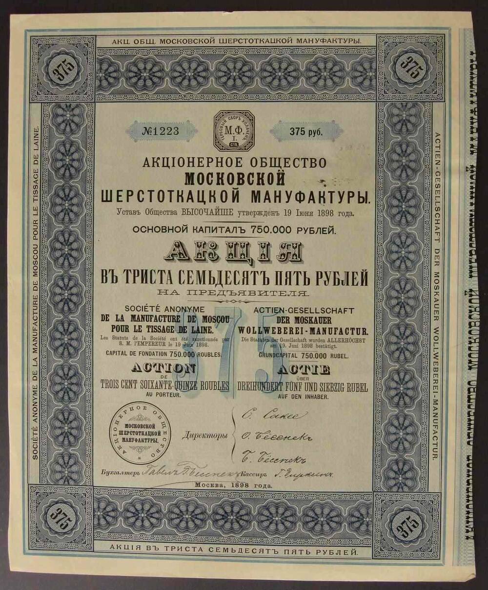 Акция. Москва. АО Московской шерстоткацкой мануфактуры. 375 руб.