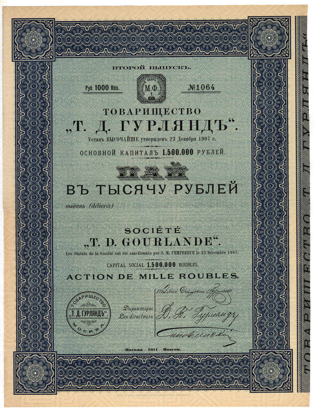 Москва. Товарищество "Т.Д. Гурлянд". Пай. 1000 руб. 2-й вып. 1911 г. № 1064
