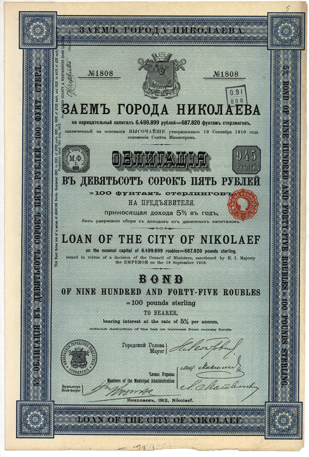 Николаев. Городской заем. Облигация. 945 руб. 1912 г. № 1808
