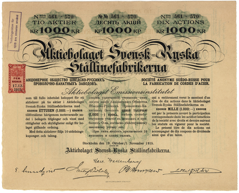 АО Шведско-русских проволочно-канатных заводов. 10 акций. 1000 крон. 1915 г. № 561-570