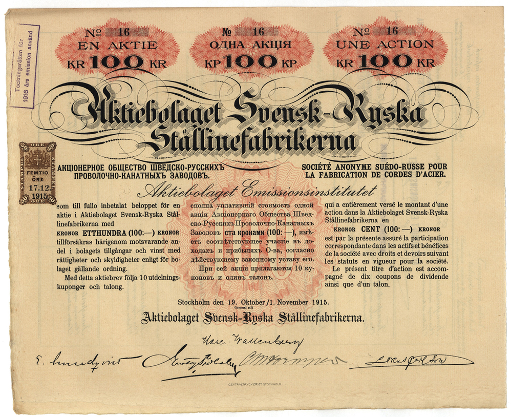 АО Шведско-русских проволочно-канатных заводов. Акция. 100 крон. 1915 г. № 16