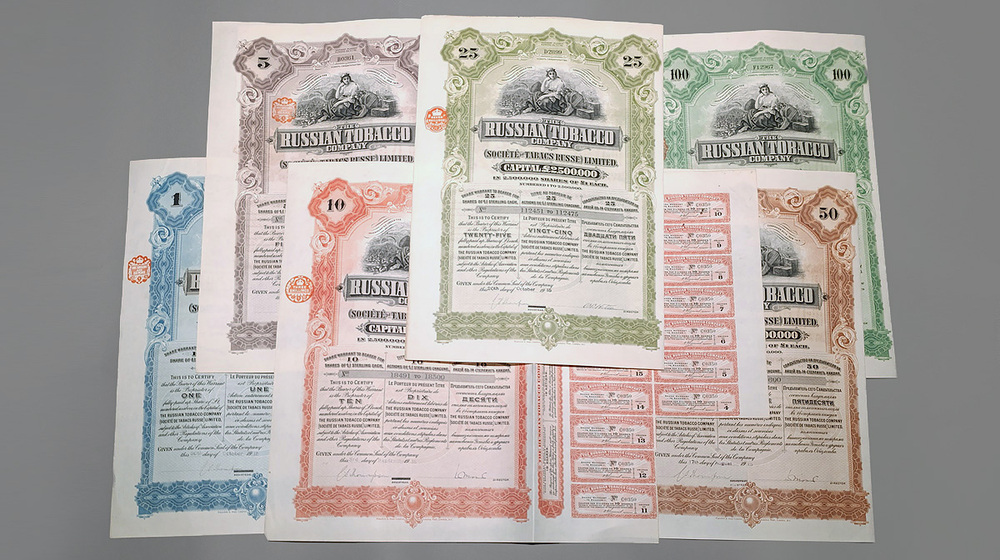 Групповой лот. Акция. Русский табак. Свидетельство на 1, 5, 10, 25, 50 и 100 акций по 1 ф. ст.