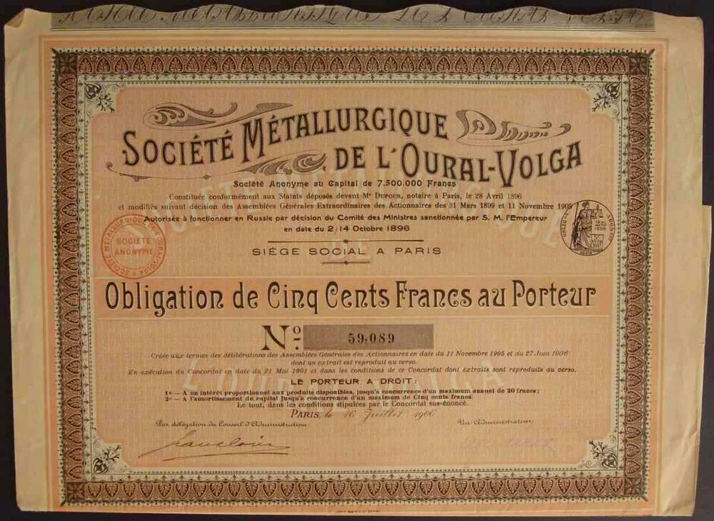 Облигация. Урал-Волга. Металлургическое общество. 4%. 500 фр.