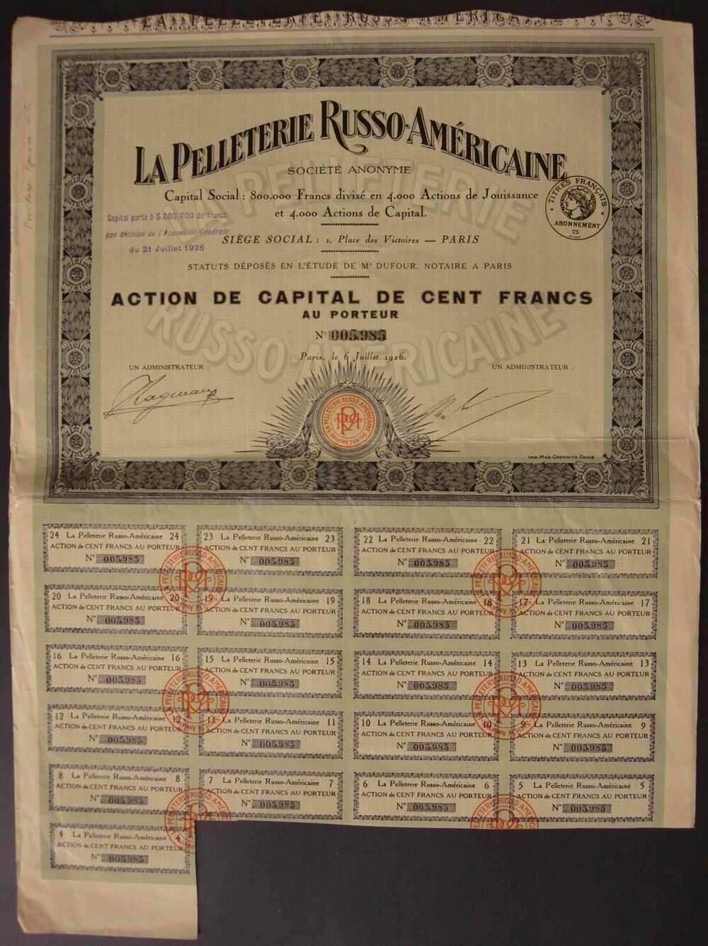 Акция. Русско-Американское АО Меховой промышленности.100 фр.