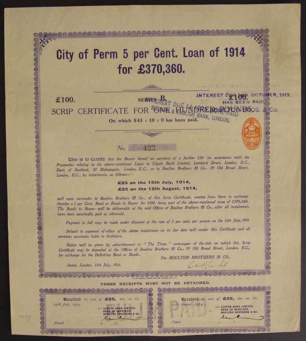 Облигация. Пермь. Сертификат 5% Городского Займа. 100 ф. ст.