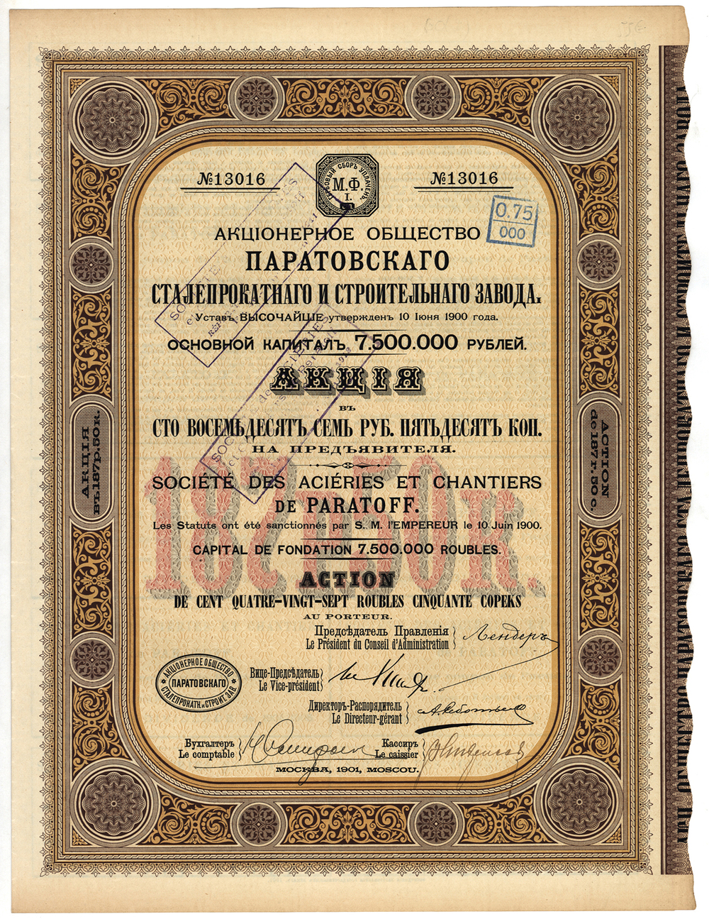 АО Паратовского сталепрокатного и строительного завода. Акция. 187 руб. 50 коп. 1901 г. № 13016