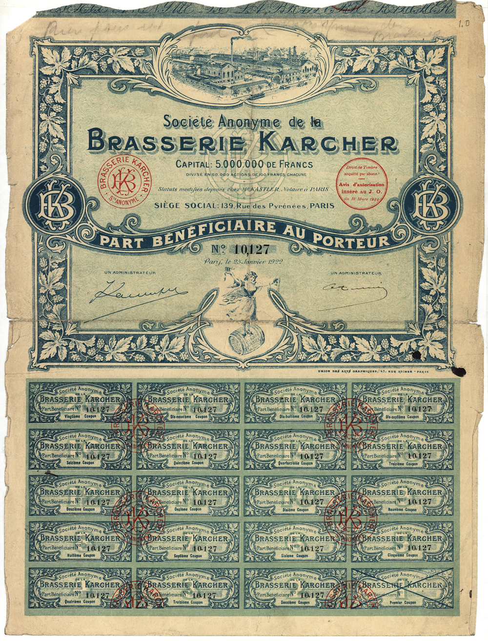 Пивоварни Керхер. Акция. 100 франков. 1922 г. № 10,127