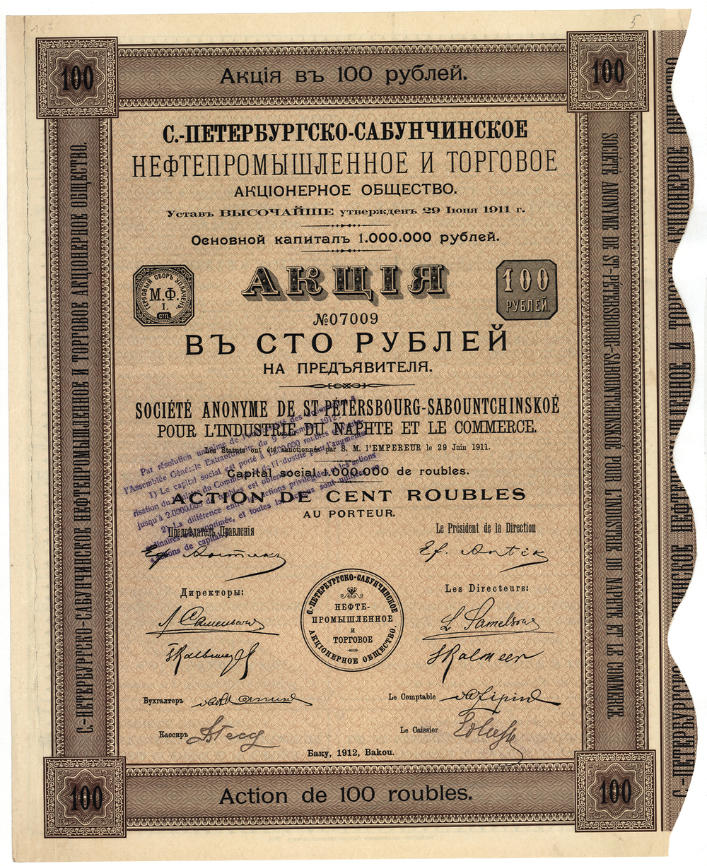 Акция. Санкт-Петербургско- Сабунчинское нефтепромышленное АО. Акция. 100руб. 1912 г. № 07009