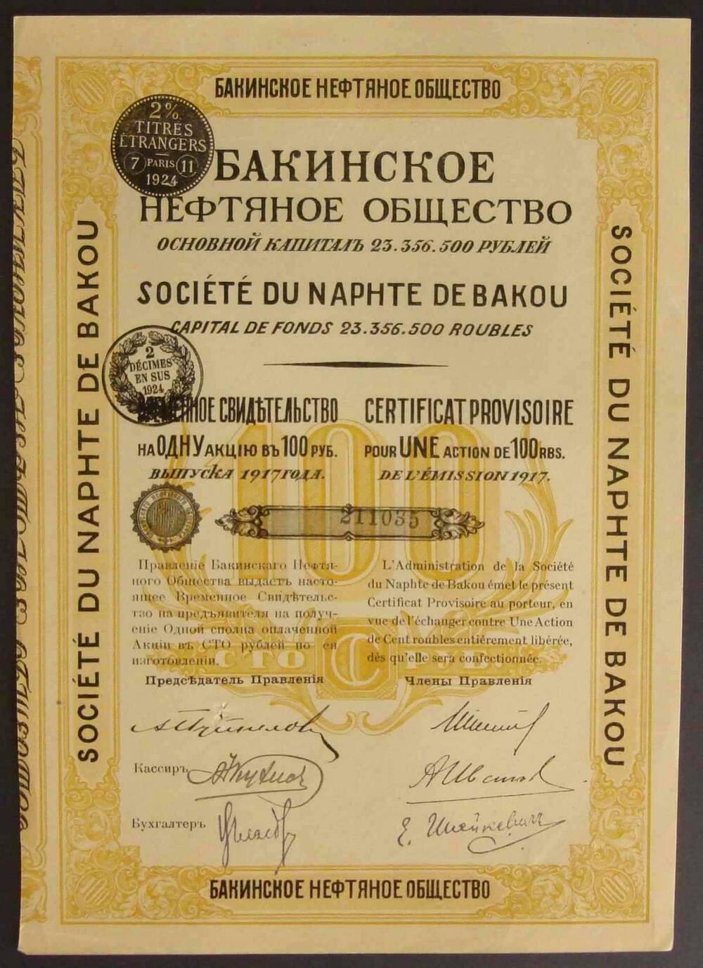 Акция. Бакинское Нефтяное Общество. Временное свидетельство на 1 акцию в 100 руб.