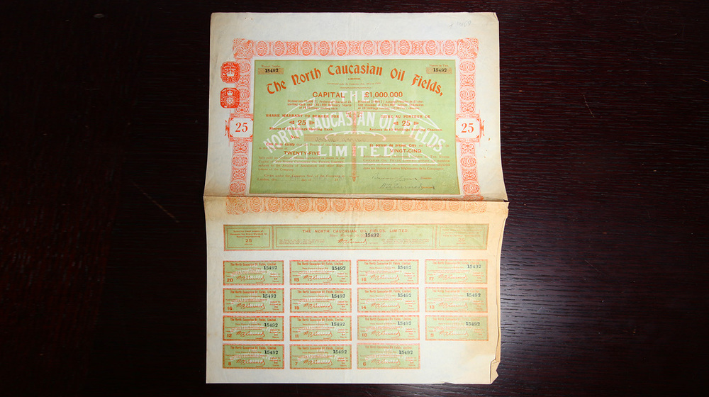 Акция. Северо-Кавказские нефтепромыслы. 25 акций по 10 шиллингов.
