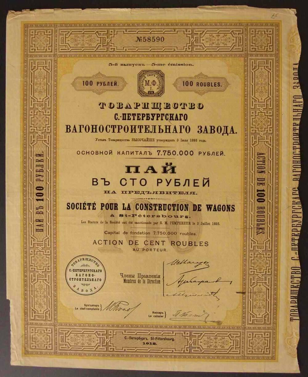 Акция. Санкт-Петербург. Вагоностроительный завод. Пай в 100 руб.