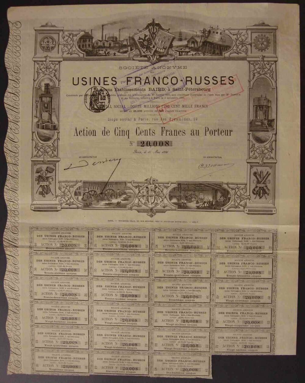 Акция. Санкт-Петербург. АО Русско-Французских Заводов (бывший Берда). 500 фр.