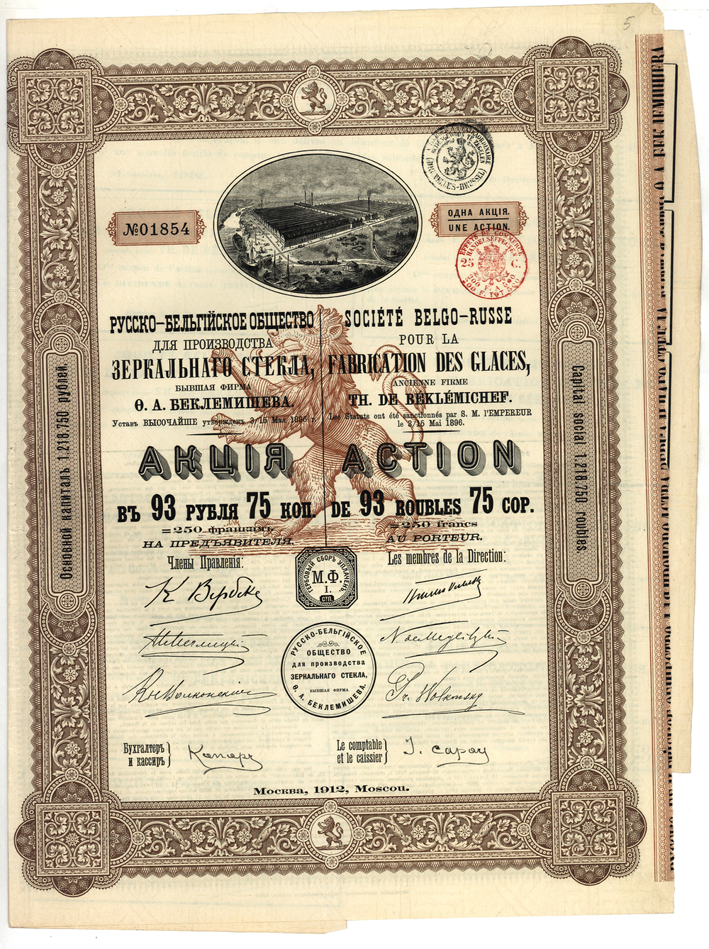 Русско-бельгийское общество для производства зеркального стекла. Акция. 93 руб. 75 коп. 1912 г.