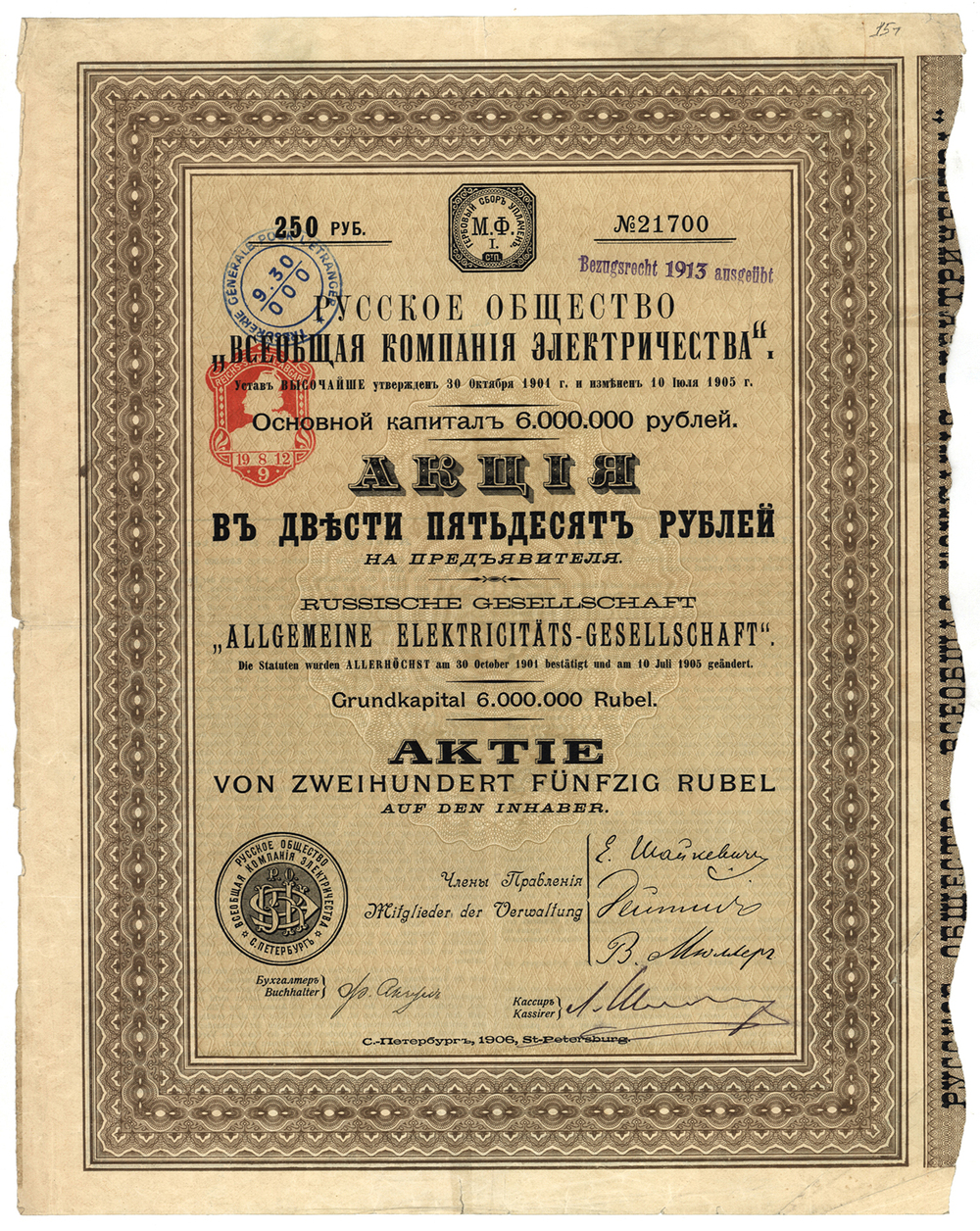 Русское общество "Всеобщая компания электричества". Акция. 250 руб. 1906 г. № 21700