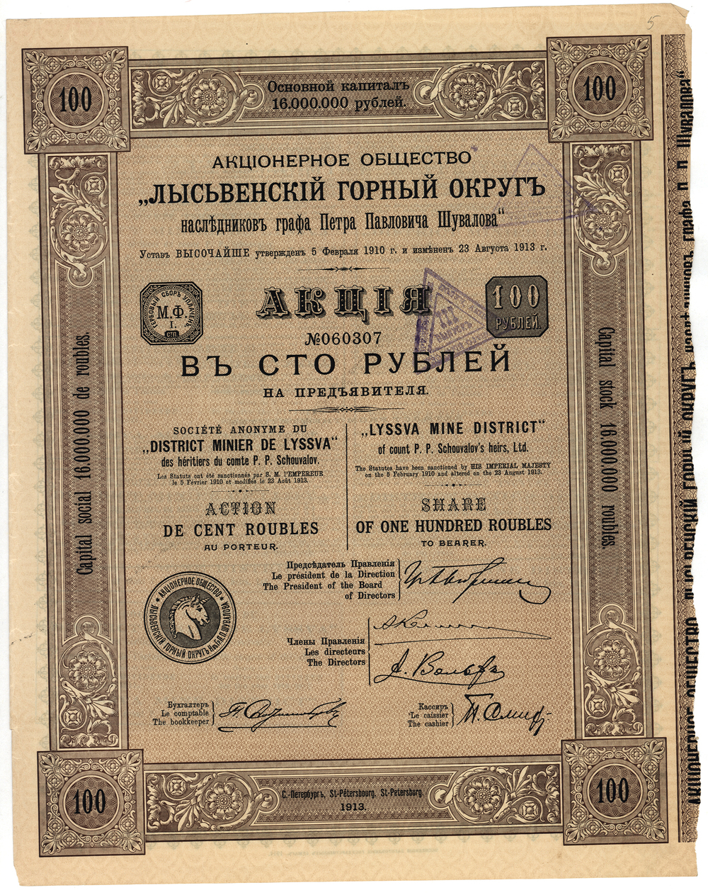 АО Лысьвенский горный округ. Акция. 100 руб. 1913 г. № 060307
