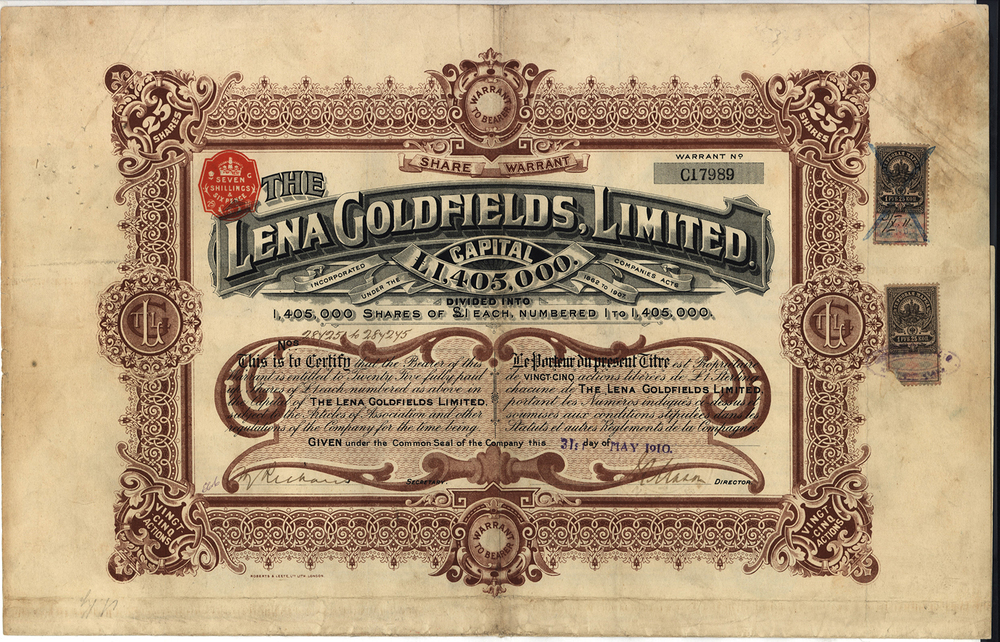 Ленские золотые прииски. 25 акций по 1 ф.ст. 1910 г. № С17989