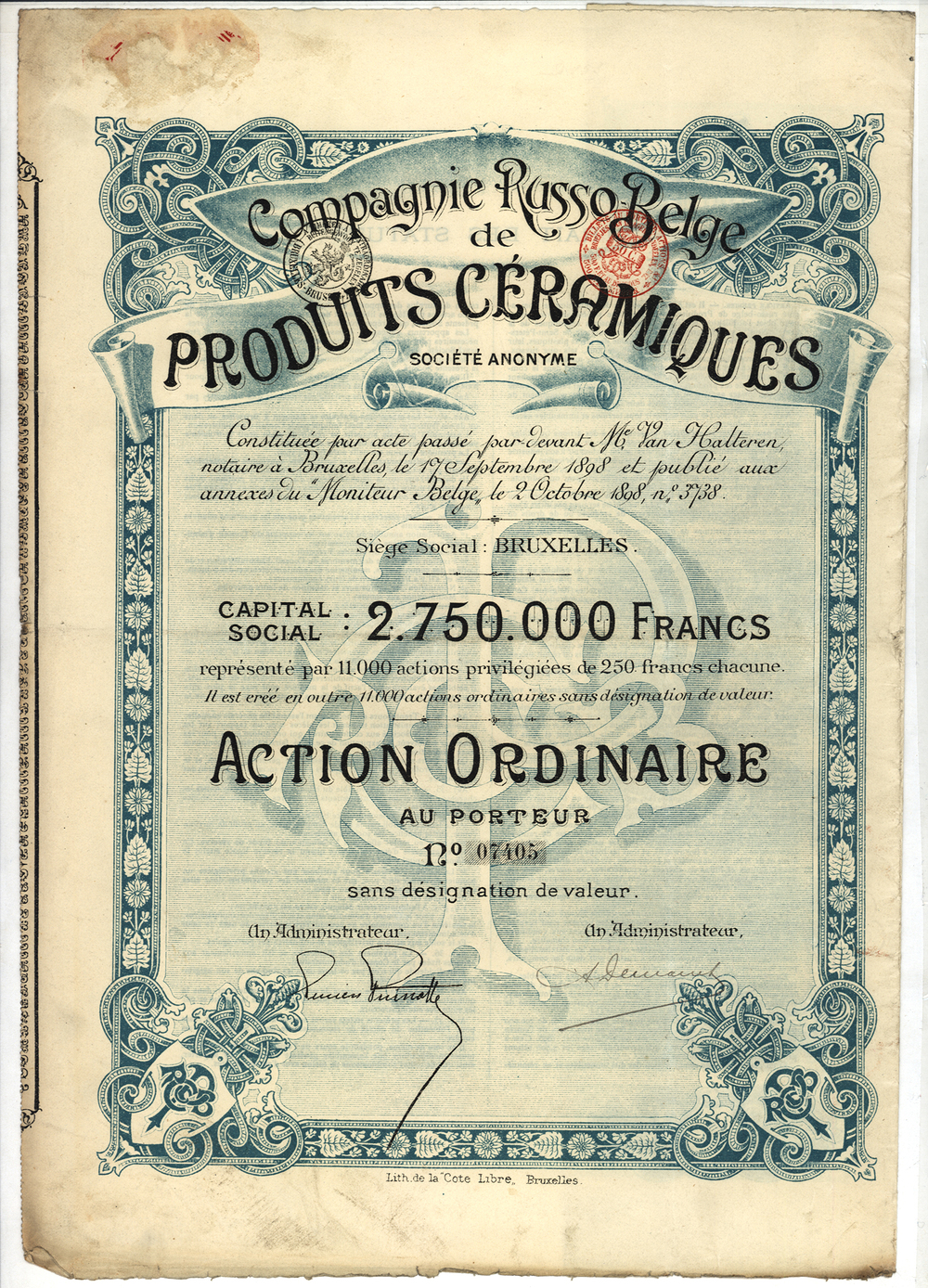 Русско-бельгийская компания керамических изделий. Акция. 250 франков. 1898 г. № 07405