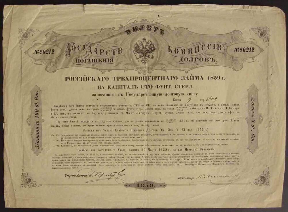 Облигация. Государственный 3% Заём. Билет 100 ф. ст.