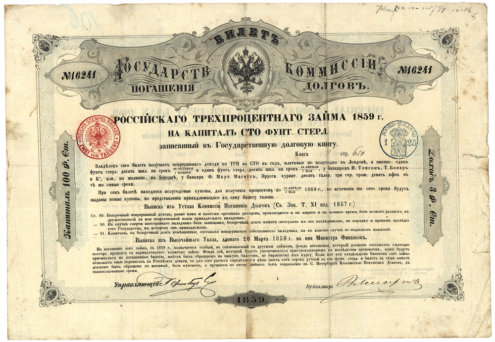 Российский 3% займ 1859 г. На капитал 100 ф. ст. № 16241