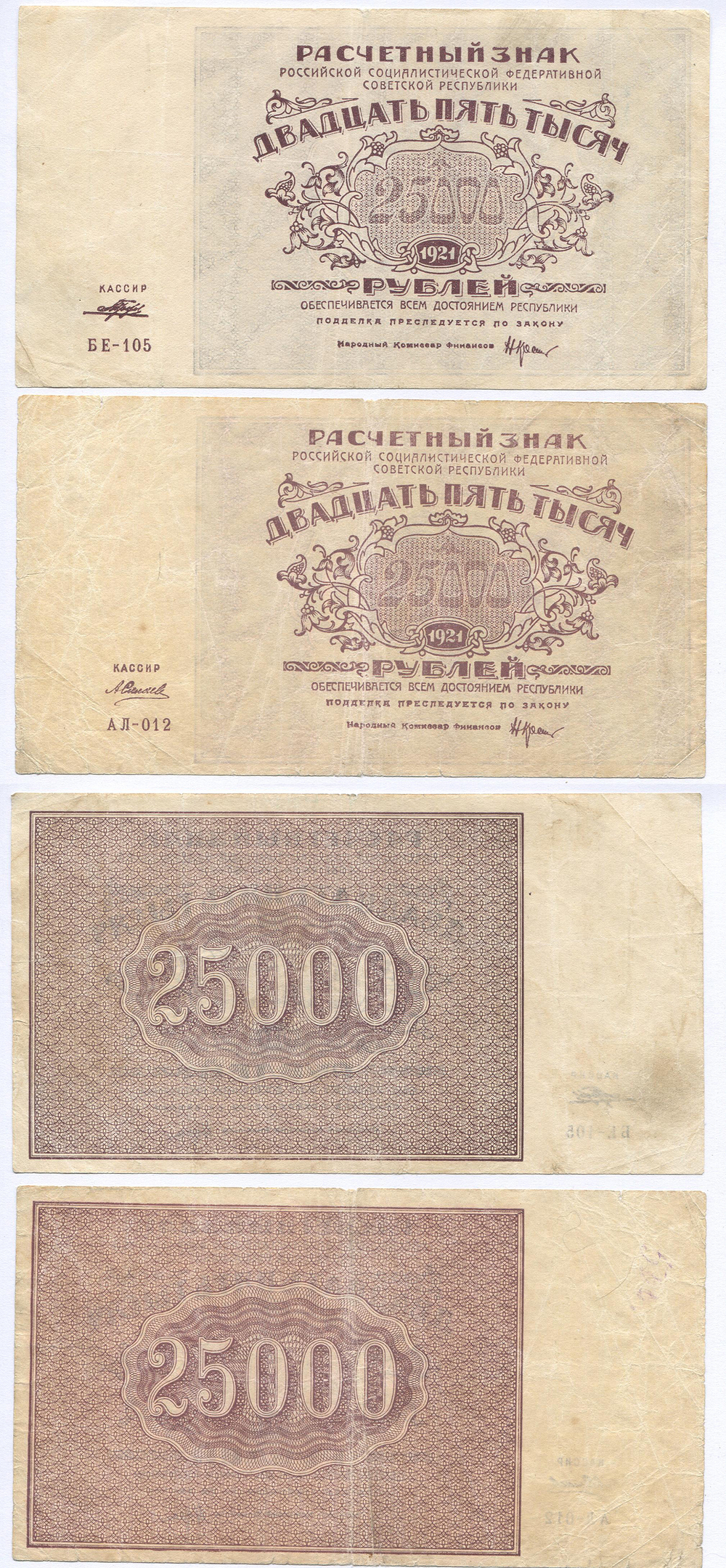 Групповой лот. РСФСР. Расчетные знаки 25.000 руб. 1921 г. 2 шт.