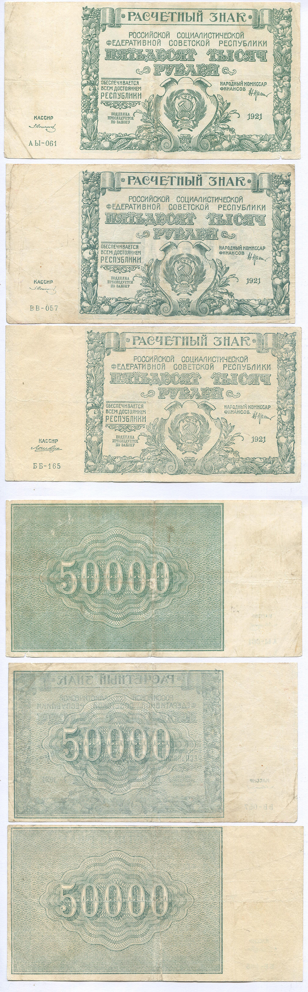Групповой лот. РСФСР. Расчетные знаки 50.000 руб. 1921 г. 3 шт.
