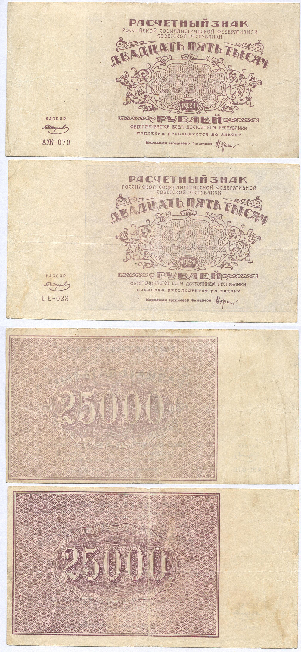 Групповой лот. РСФСР. Расчетные знаки 25.000 руб. 1921 г. 2 шт.