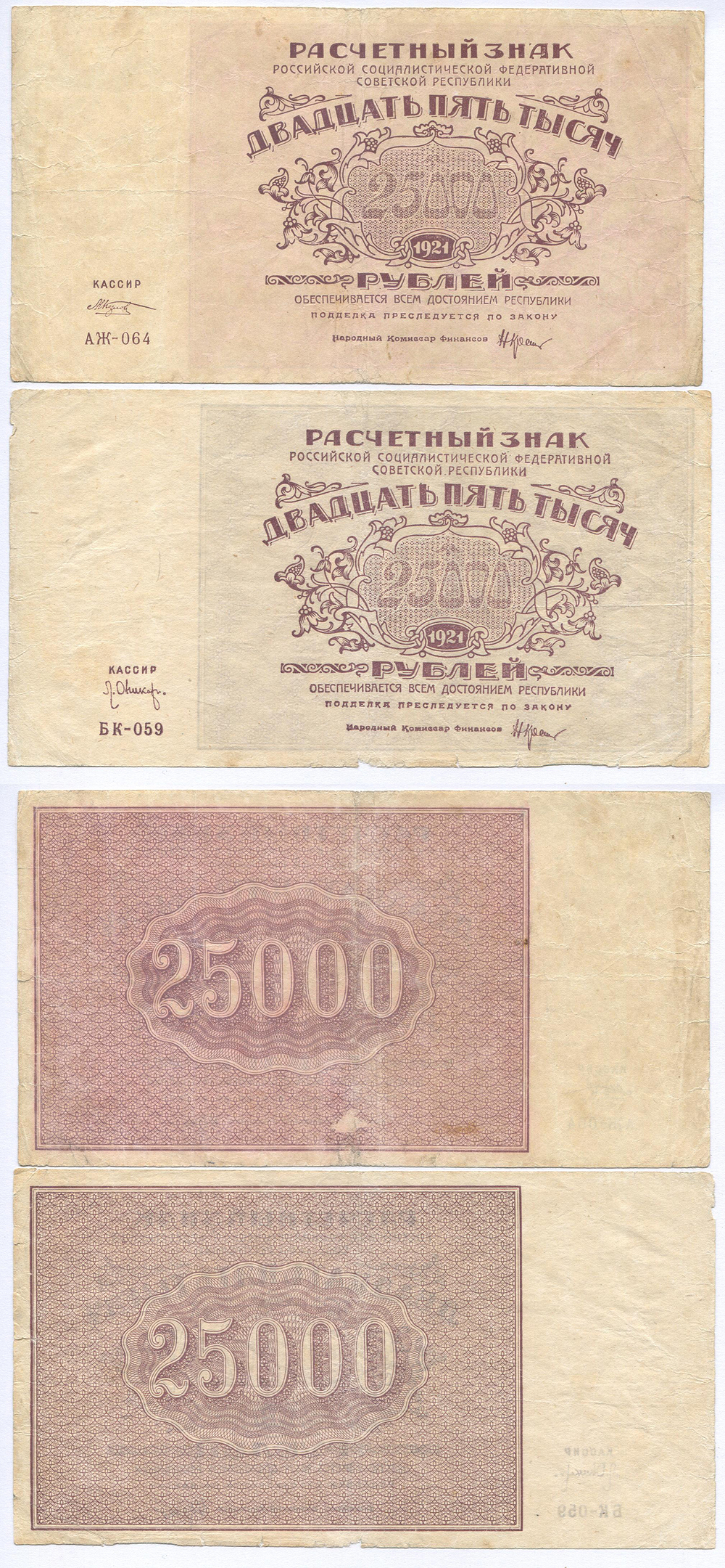 Групповой лот. РСФСР. Расчетные знаки 25.000 руб. 1921 г. 2 шт.