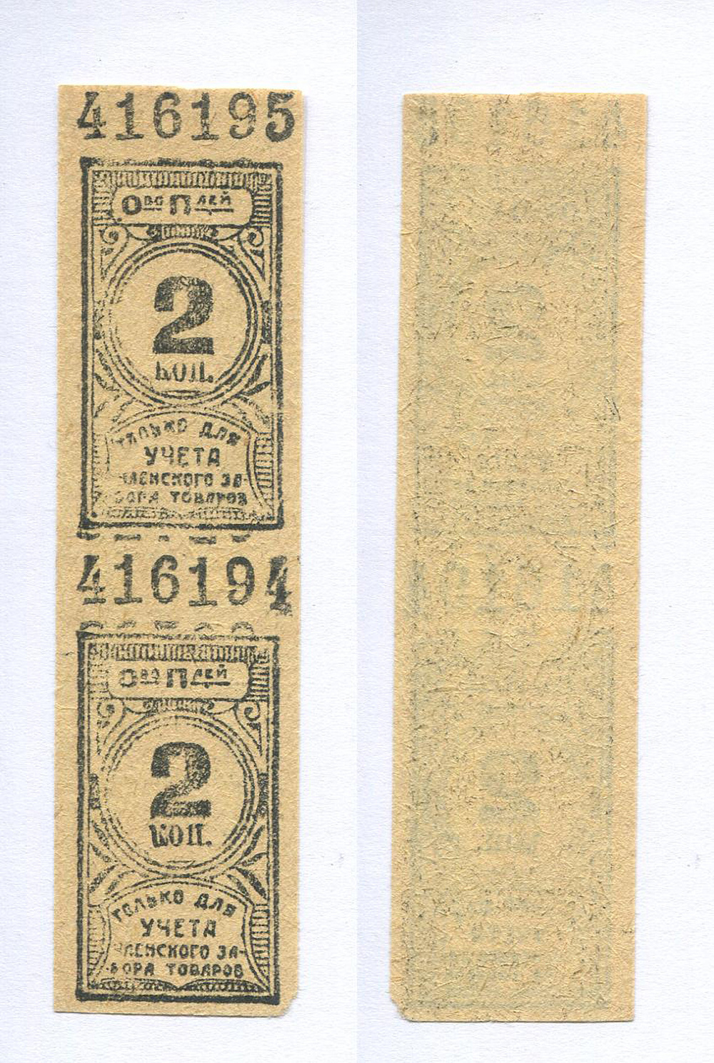 Общество потребителей. 2 коп. Только для учета членского забора товаров. № 416195 сцепка