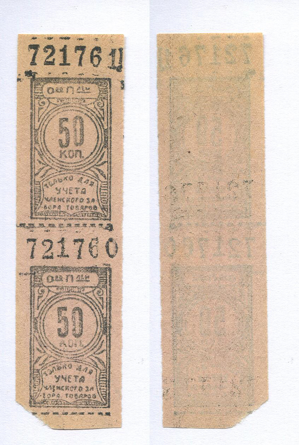 Общество потребителей. 50 коп. Только для учета членского забора товаров. № 721760 сцепка