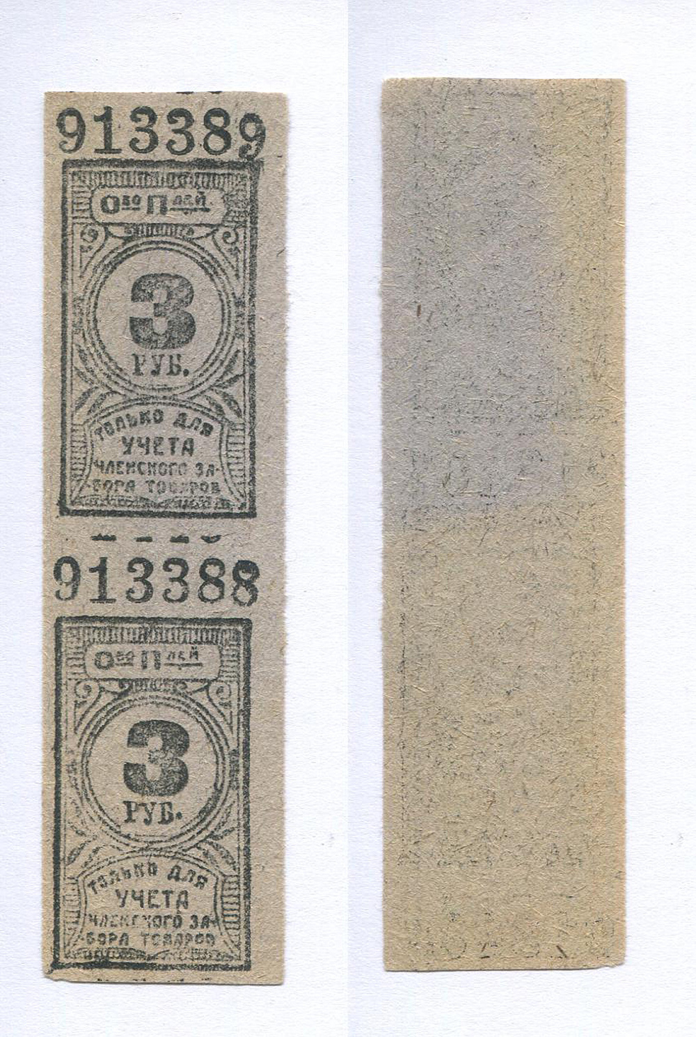 Общество потребителей. 3 руб. Только для учета членского забора товаров. № 913389 сцепка