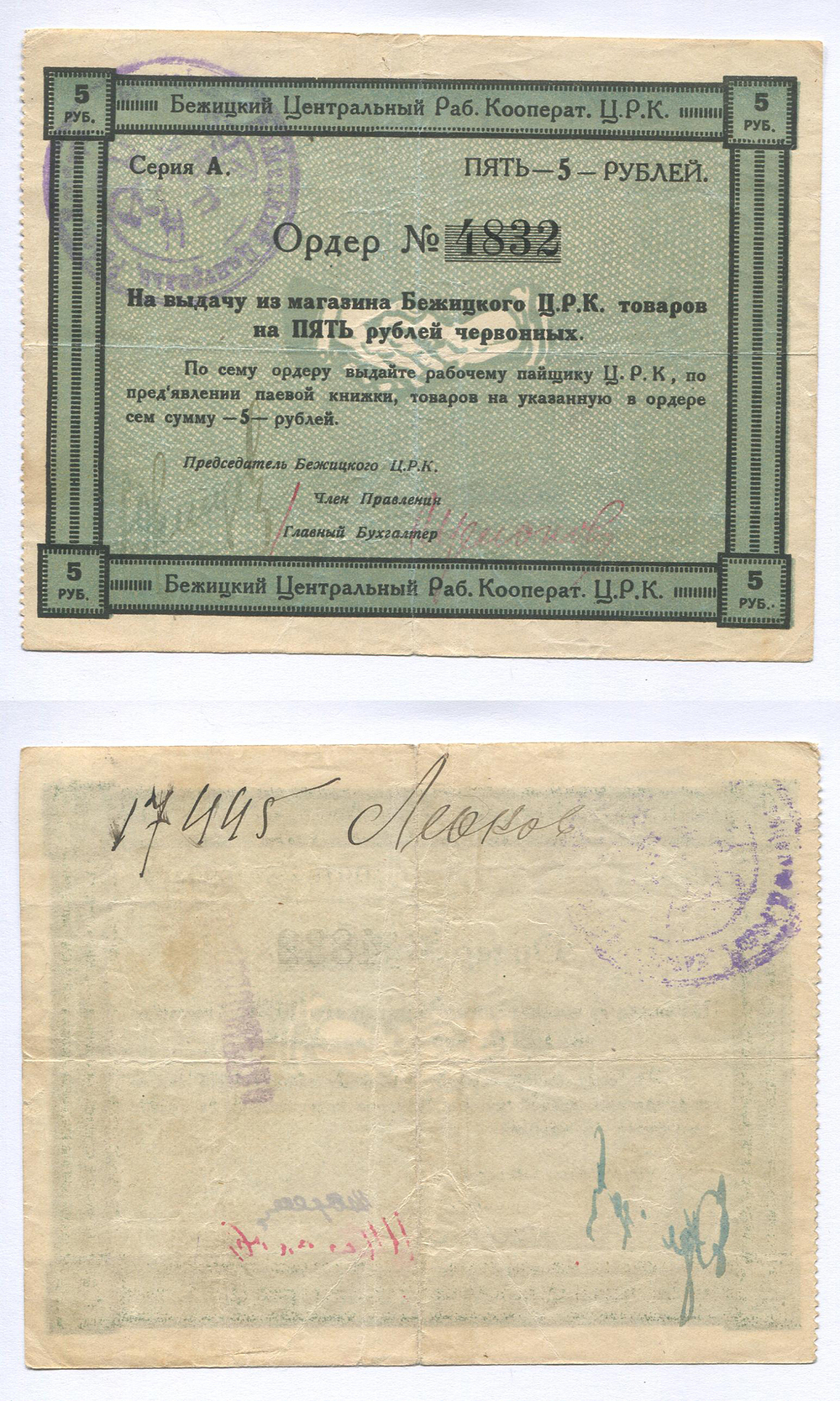 Бежица (Брянской губ.). ЦРК. Ордер. 5 руб. Рябч.2 № 3014 # 4832 с печатью и подписями