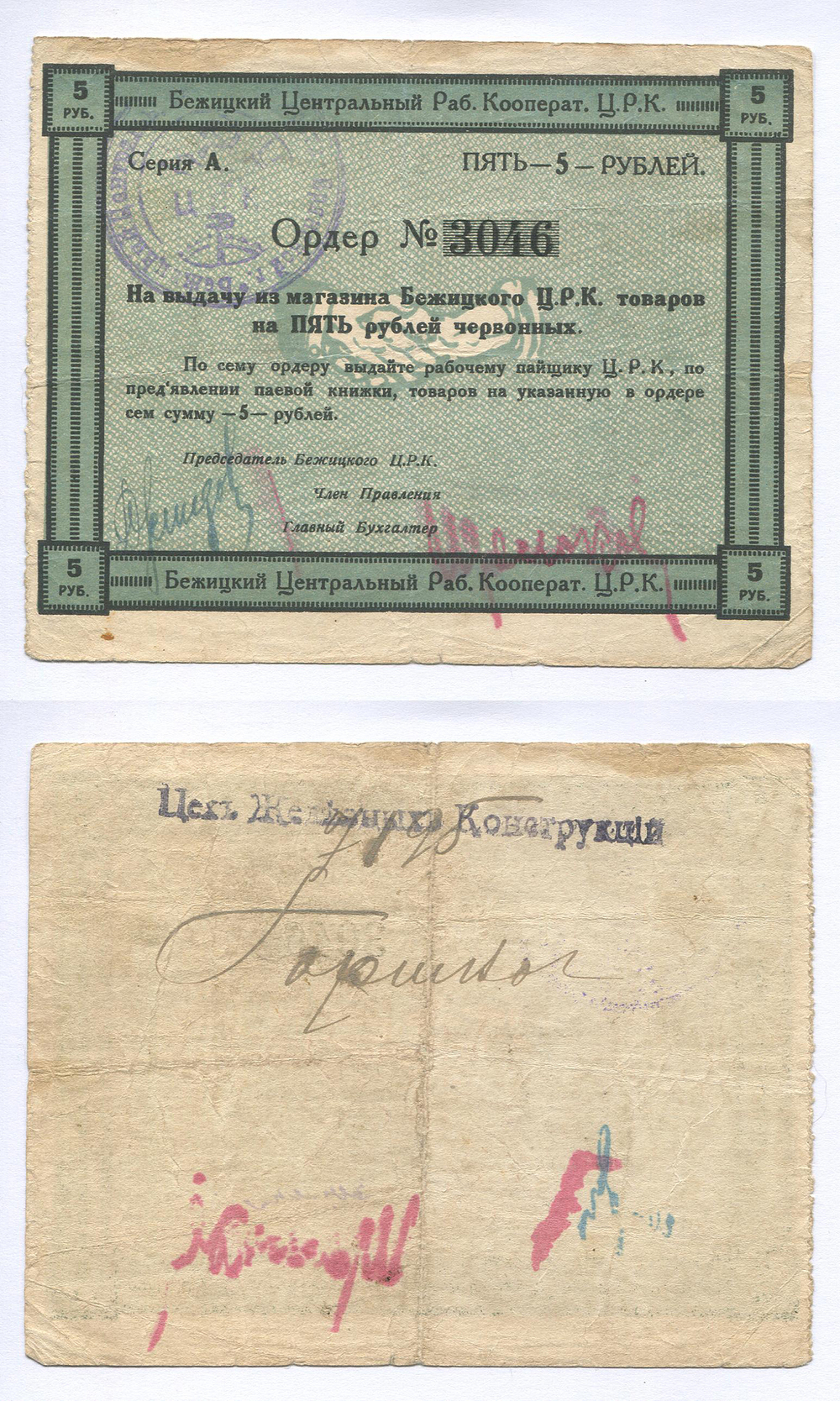 Бежица (Брянской губ.). ЦРК. Ордер. 5 руб. Рябч.2 № 3014 # 3046 с печатью и подписями