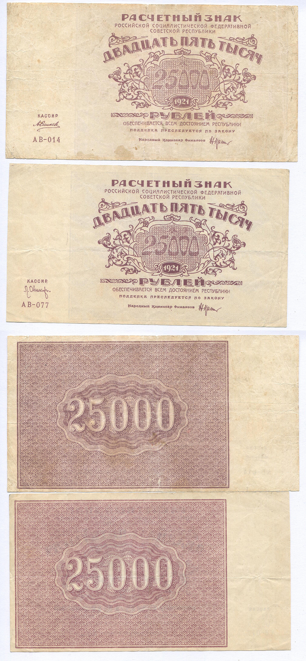 Групповой лот. РСФСР. Расчетные знаки 25.000 руб. 1921 г. 2 шт.