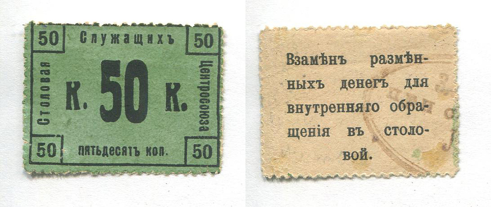 Москва. Столовая служащих Центросоюза. Марка. 50 коп. Рябч.2 № 3329 (печать на реверсе)
