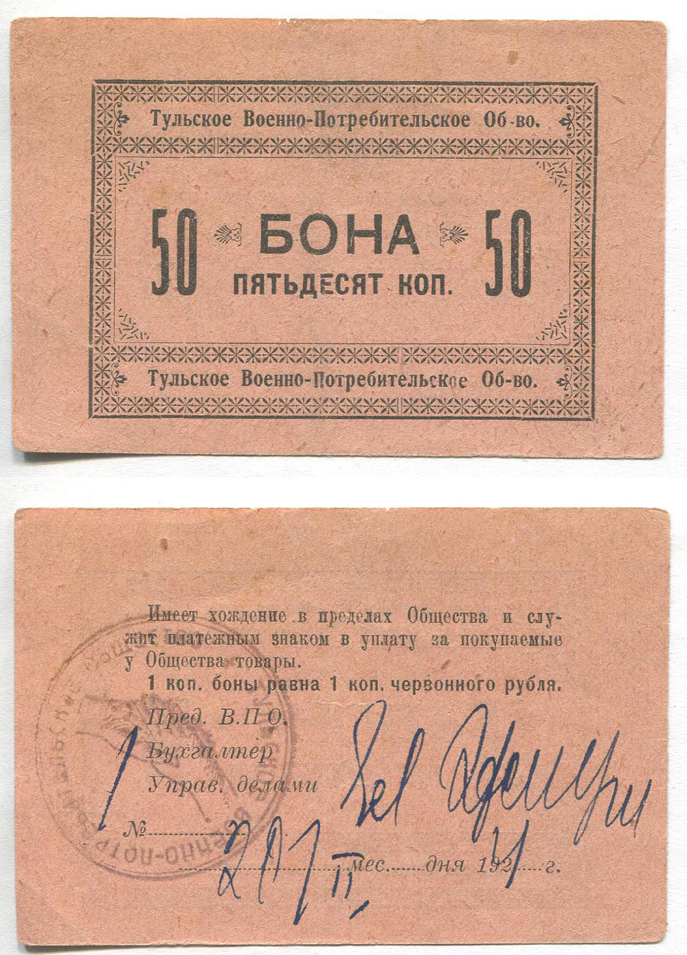 Тула. Военно-Потребительское Общество. Бона. 50 коп. Рябч.2 № 3578 б/г
