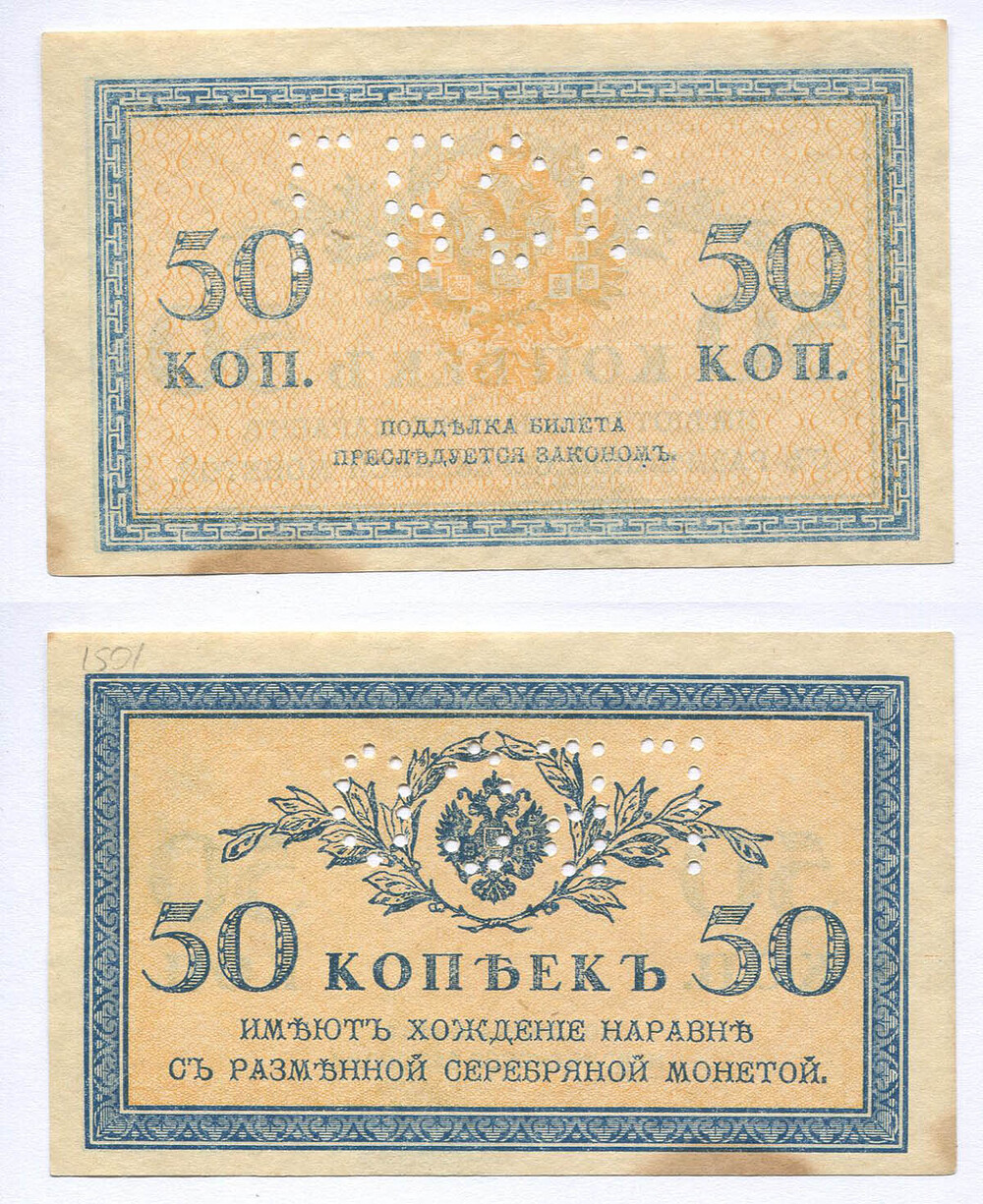 Российская империя. Казначейский знак. 50 коп. АА № E3.8 (1915 г.) перфорация ГБСО