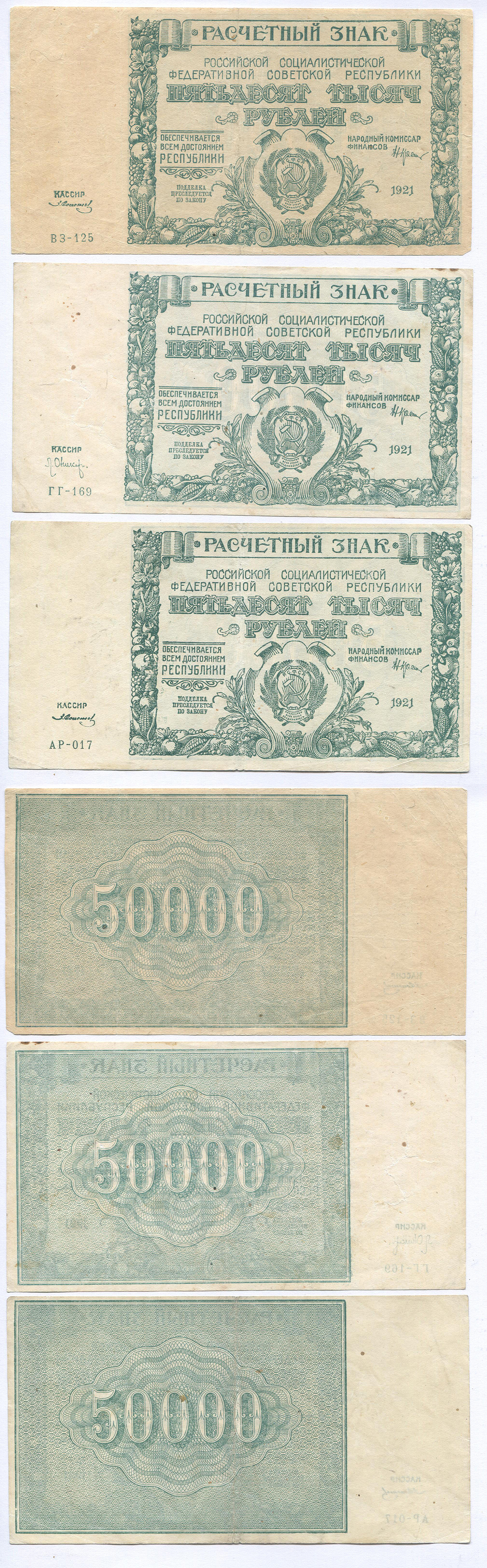 Групповой лот. РСФСР. Расчетные знаки 50.000 руб. 1921 г. 3 шт.
