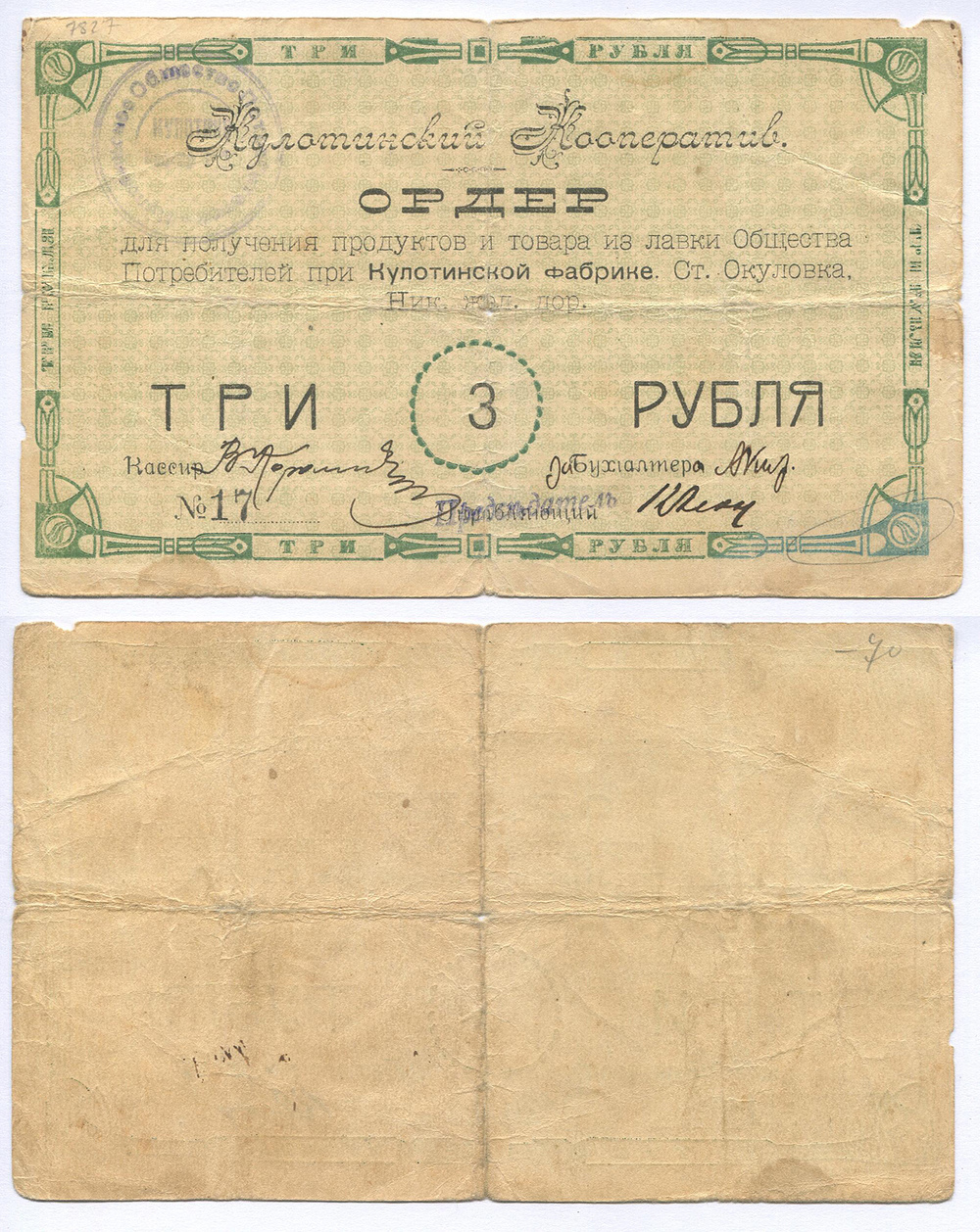 Окуловка. Общество Потребителей при Кулотинской фабрике. Ордер. 3 руб. Рябч.2 № 2637 # 17