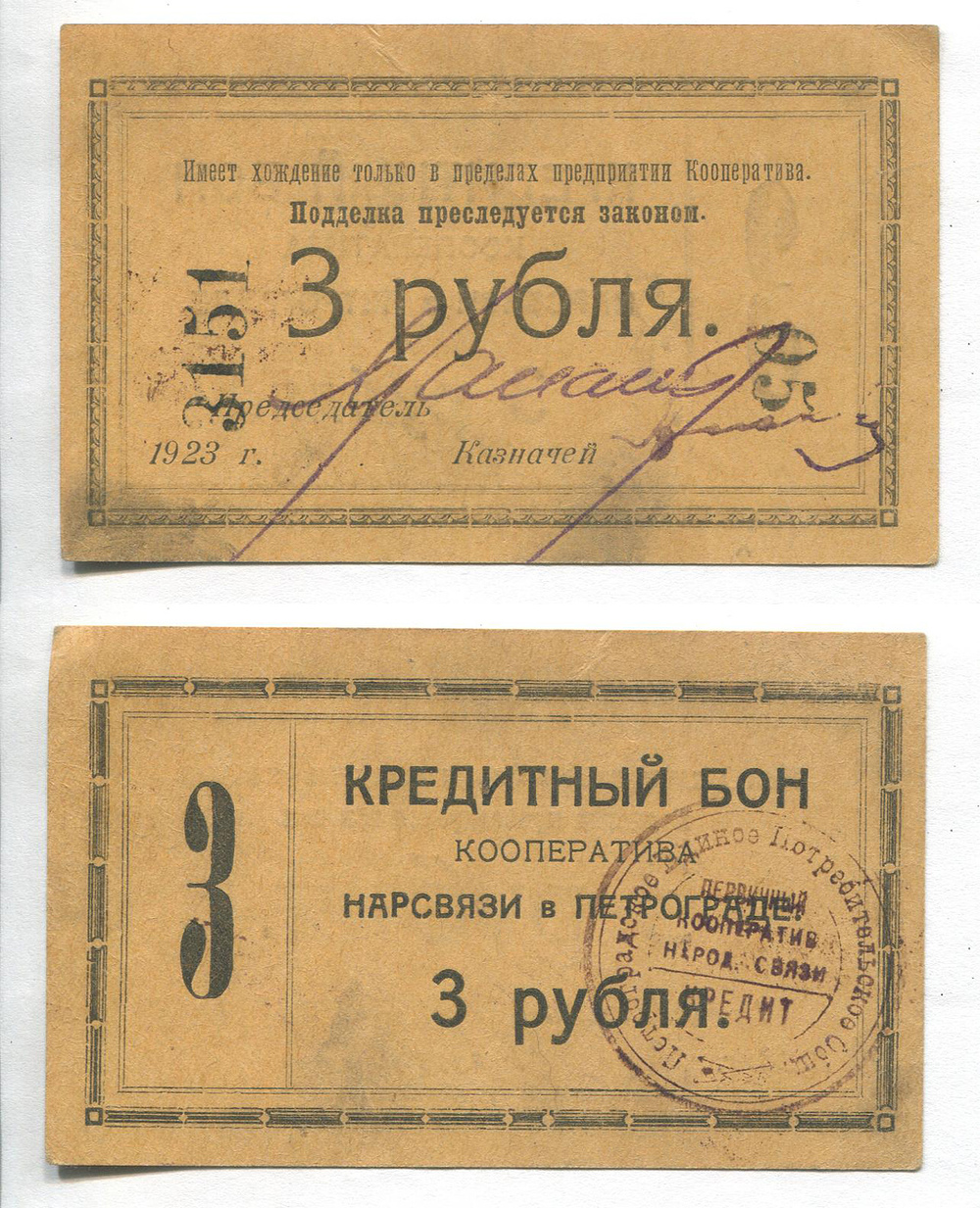 Санкт-Петербург. Кооператив Нарсвязи. Кредитный бон. 3 руб. Рябч.2 № 2255 # 05-3151