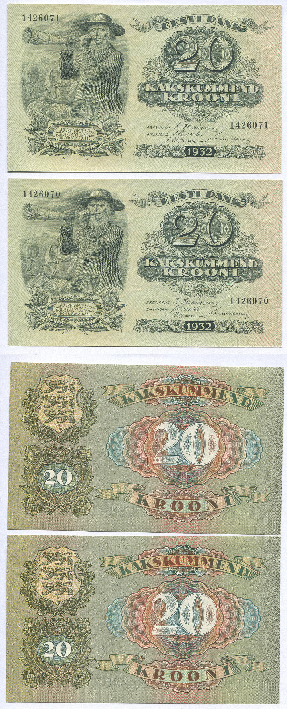 Групповой лот. Эстония. 20 крон. Рябч.2 № 23060 # 1426070, 1426071 Номера подряд, 2 шт.