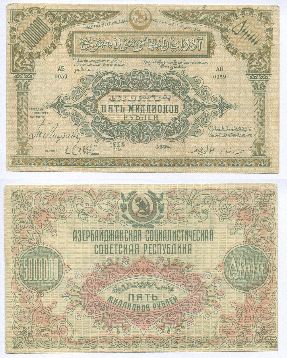 Азербайджан. Соц. Сов. Республика. 5 млн. руб. Рябч.2 № 21322 # АБ 0059 Без в/з