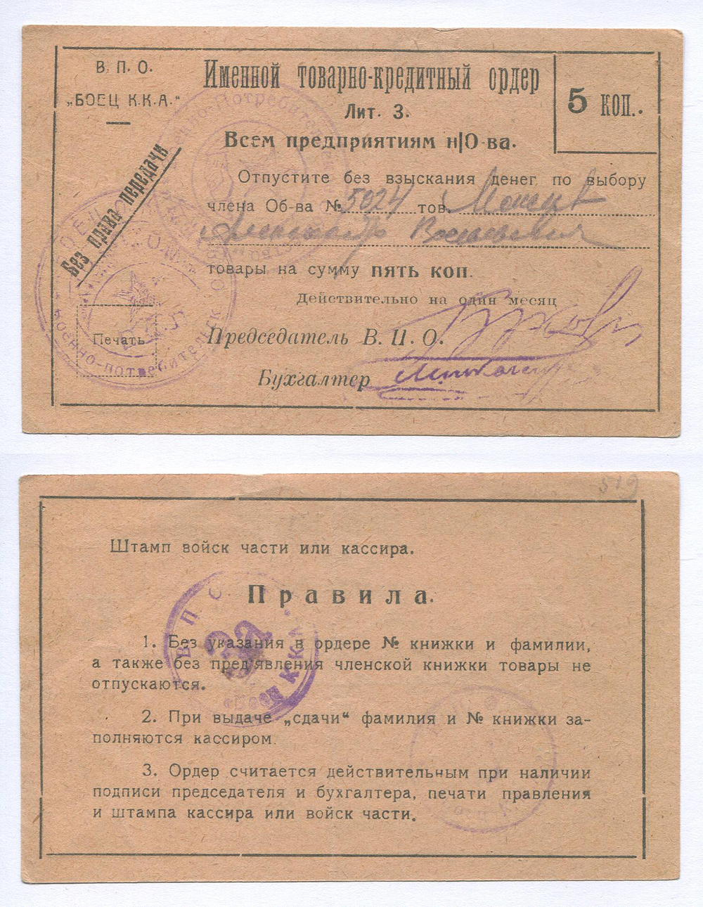Тифлис. В. П. О. "Боец Р. К. А.". Именной товарно-кредитный ордер. 5 коп. Рябч.2 № 21178 Лит. З.