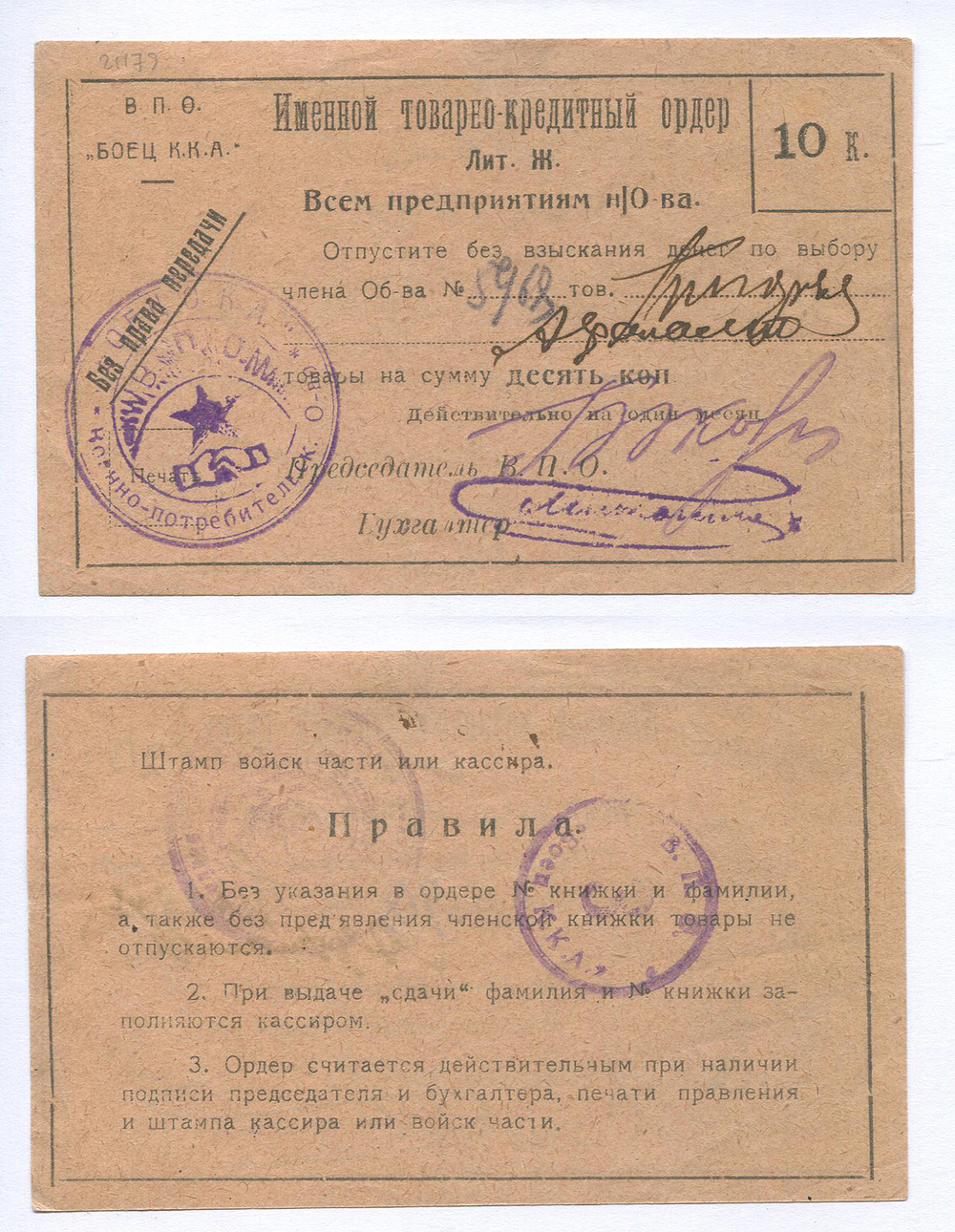 Тифлис. В. П. О. "Боец Р. К. А.". Именной товарно-кредитный ордер. 10 коп. Рябч.2 № 21179 Лит. Ж.