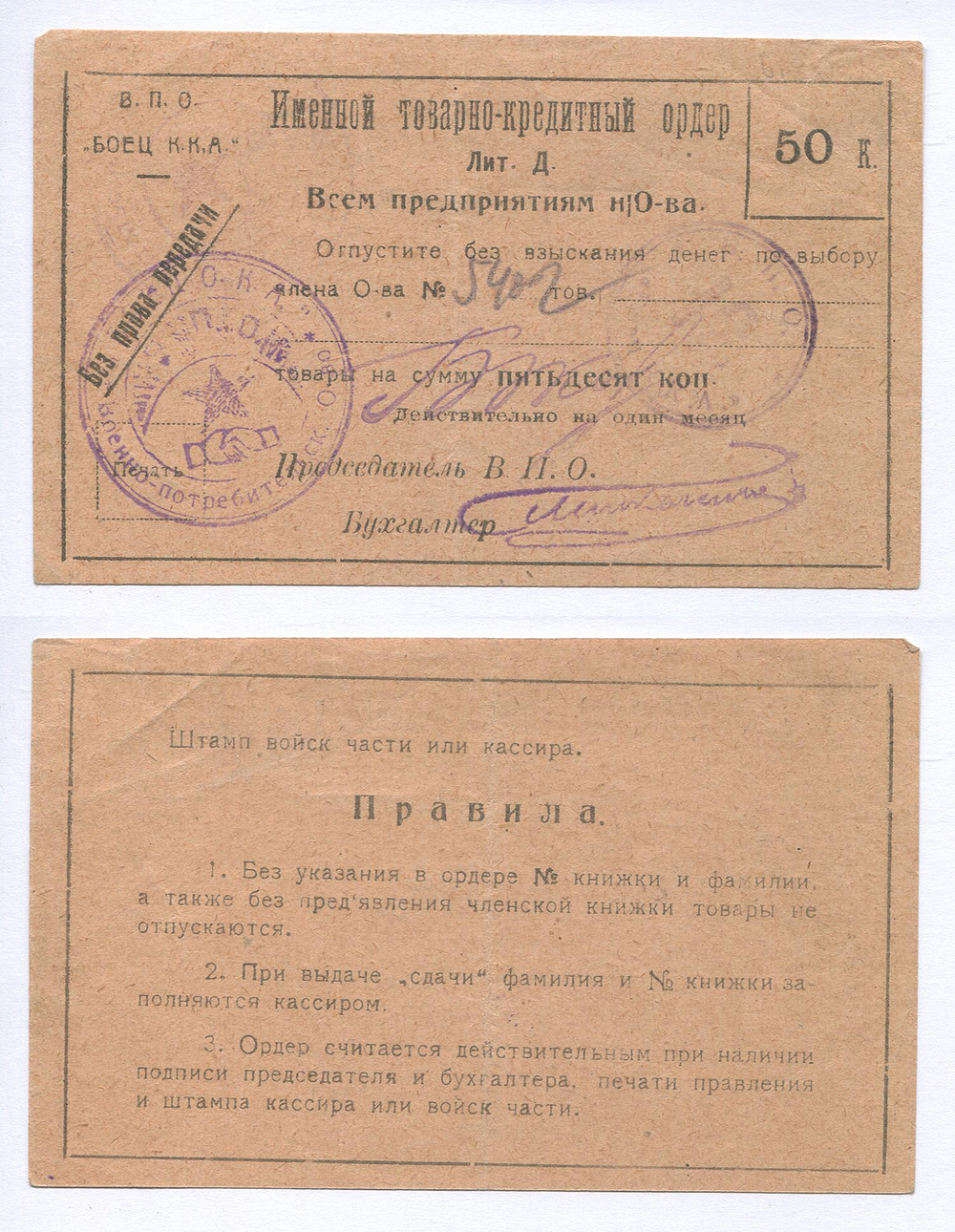 Тифлис. В. П. О. "Боец Р. К. А.". Именной товарно-кредитный ордер. 50 коп. Рябч.2 № 21181 Лит. Д.