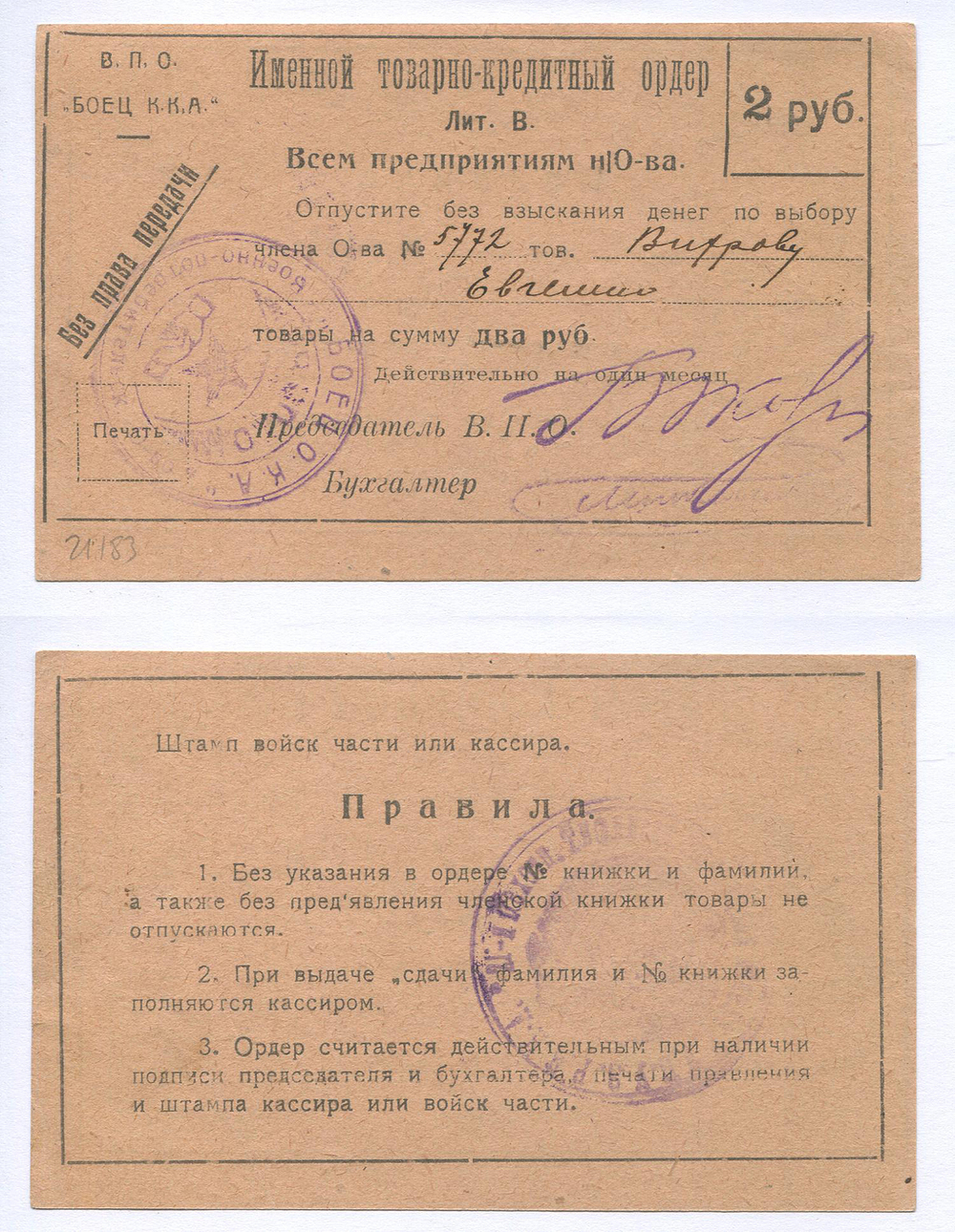 Тифлис. В. П. О. "Боец Р. К. А.". Именной товарно-кредитный ордер. 2 руб. Рябч.2 № 21182 Лит. В.