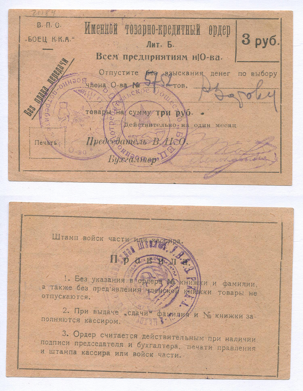 Тифлис. В. П. О. "Боец Р. К. А.". Именной товарно-кредитный ордер. 3 руб. Рябч.2 № 21184 Лит. Б.