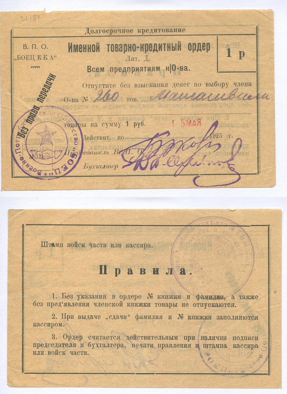 Тифлис. В. П. О. "Боец Р. К. А.". Именной товарно-кредитный ордер. 1 руб. Рябч.2 № 21182 Лит. Д